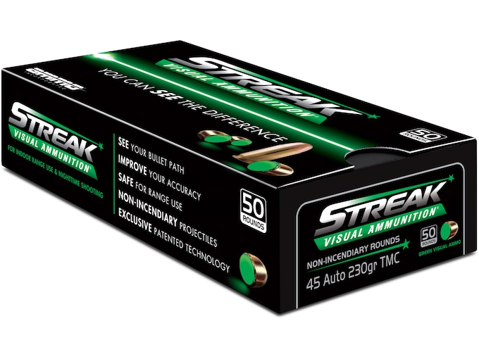 STREAK?s exclusive patented technology allows the shooter to visually see the projectile?s path towards its target. STREAK rounds are non-incendiary, they do not generate heat so they are safe to use in environments where traditional tracers are prohibited and can be a serious fire hazard. The results are game changing in many aspects for the consumer, law enforcement and military. For indoor RANGE use and nighttime shooting. This ammunition is new production, non-corrosive, in boxer primed, reloadable brass cases.FeaturesPatented technology allows the shooter to keep a visual on the projectile?s path toward its target.Next Generation, non flammable visual tracer-style ammunition ? because it is not an incendiary round, it?s safe for both indoor and outdoor use.Features HyperClean Technology up to 50% less cleaning timeIncrease shooting enjoyment and accuracy?? Made In United States of AmericaWARNING: This product can expose you to Lead, which is known to the State of California to cause cancer and birth defects or other reproductive harm. For more information go to – www.P65Warnings.ca.gov.