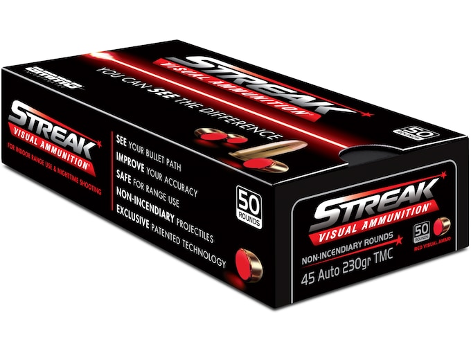 STREAK?s exclusive patented technology allows the shooter to visually see the projectile?s path towards its target. STREAK rounds are non-incendiary, they do not generate heat so they are safe to use in environments where traditional tracers are prohibited and can be a serious fire hazard. The results are game changing in many aspects for the consumer, law enforcement and military. For indoor RANGE use and nighttime shooting. This ammunition is new production, non-corrosive, in boxer primed, reloadable brass cases.FeaturesPatented technology allows the shooter to keep a visual on the projectile?s path toward its target.Next Generation, non flammable visual tracer-style ammunition ? because it is not an incendiary round, it?s safe for both indoor and outdoor use.Features HyperClean Technology up to 50% less cleaning timeIncrease shooting enjoyment and accuracy?? Made In United States of AmericaWARNING: This product can expose you to Lead, which is known to the State of California to cause cancer and birth defects or other reproductive harm. For more information go to – www.P65Warnings.ca.gov.