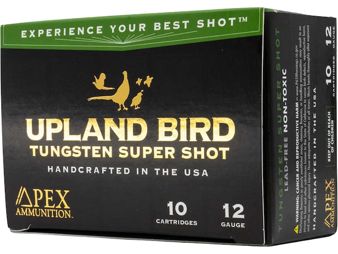 Apex Ammunition Upland Bird TSS is the most lethal and versatile alloy ever created. Light, fast and agile, it?s the ultimate shotshell even for upland hunting. Non-toxic has always meant reduced performance and with federal and state regulations increasing the mandate of non-toxic shot, you?ll sacrifice nothing. Simply put, Apex built this to be the ultimate upland round for any hunt. Made In United States of AmericaWARNING: This product can expose you to Lead, which is known to the State of California to cause cancer and birth defects or other reproductive harm. For more information go to – www.P65Warnings.ca.gov.