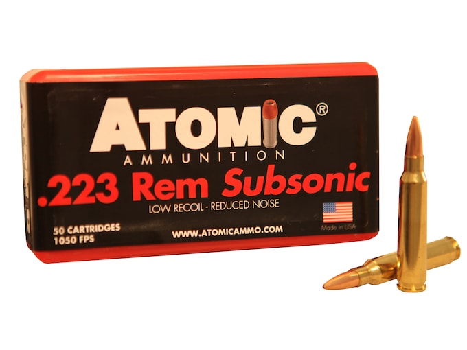 Atomic Ammunition?s 223 Remington Subsonic is unlike any .223 Rem ammunition. It is quieter than most .22 Long Rifle ammo, has virtually no felt recoil, produces the same energy and power as most 380 ACP ammunition and delivers excellent accuracy out to 100 yards from rifles with barrel twist rates of 1 in 7?? or faster. This ammunition is not specifically designed to cycle semi or fully automatic weapons.?This specialty ammunition is perfect for new and smaller framed shooters who are learning to shoot their family?s full size hunting rifles, seniors who have become recoil sensitive due to age, persons who only have access to indoor shooting ranges that do not allow high powered rifles because of the noise they generate that echoes off of the walls or fear that the bullet will generate so much power that it will pass through or tear up the backstop. It can be fired on smaller plots of land that are safe for firing handguns but where a miss with a rifle bullet would likely travel beyond the property, or the use of a full powered rifle load would disturb nearby neighbors.
