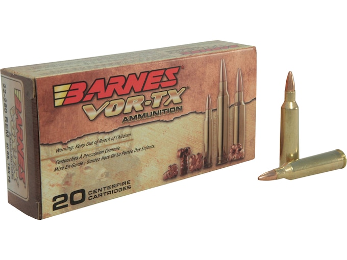 Loaded with the Barnes Triple-Shock X (TSX) Bullet, this round offers devastating results on varmints. The Barnes TSX bullet is made of 100% copper and contains no lead. When the bullet expands, four razor-sharp cutting petals are created, allowing the bullet to penetrate farther through tough bone and tissue. These bullets usually retain 100% of their original weight. The Triple-Shock X bullet delivers the “three strikes you’re out” rule. Once as it strikes game, two as the bullet begins to open and a third impact when the cavity fully expands to deliver extra shock with maximum transferred energy. Ideal for varmints as well as deer-sized game.