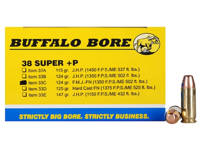 By popular demand, Buffalo Bore is introducing five new 38 Super+P loads. With three different expanding loads and two penetrating loads, we have covered the basis of anything you’d like to accomplish with the 38 Super+P cartridge. These are full power 38 Super+P loads. All five of these loads feature flash suppressed powders so the shooter will not be blinded if firing in low light. Feeding, function and accuracy was very good in all three of our test pistols. See the below velocities from my personal real world pistols, not factory test barrels.