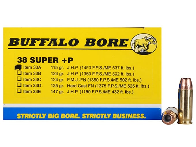 By popular demand, Buffalo Bore is introducing five new 38 Super+P loads. With three different expanding loads and two penetrating loads, we have covered the basis of anything you’d like to accomplish with the 38 Super+P cartridge. These are full power 38 Super+P loads. All five of these loads feature flash suppressed powders so the shooter will not be blinded if firing in low light. Feeding, function and accuracy was very good in all three of our test pistols. See the below velocities from my personal real world pistols, not factory test barrels.