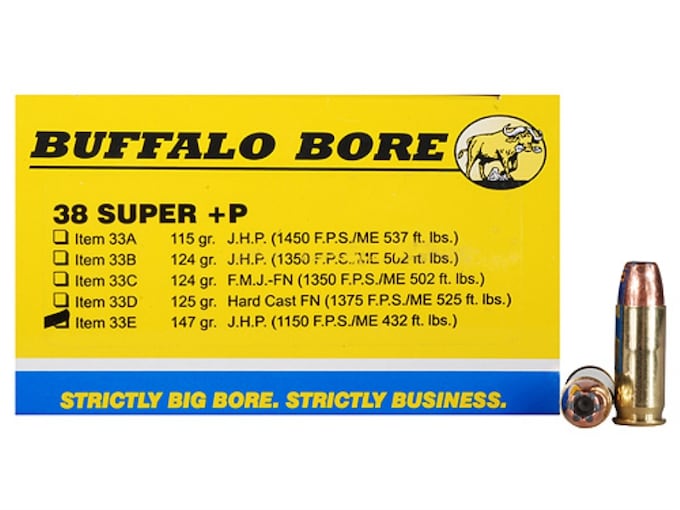 Buffalo Bore Outdoorsman 38 Super +P Ammo 147 Grain Jacketed Hollow Point Box of 20