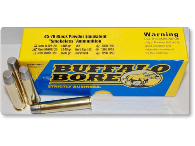 Buffalo Bore low pressure ?Black Powder Equivalent? 45-70 loads are safe to use in ?Trap Door? actions, assuming the action is in normal operating condition. Original (1873) 45-70 Govt. ammo was released to the military, in the military rifle of the day, which was the Springfield model 1873. SAAMI has set 45-70 pressure levels at 28,000 PSI, which is potentially enough pressure to damage trap door actions, depending on the pressure curve of the ammo. Most authorities believe that 18,000 to 20,000 PSI is safe for all trap door actions that are in normal operating condition. These loads are operating at or below 18,000 PSI.?We know from history that 45-70 loads of this power level literally pounded 2,000+ lb. bison. As bullet diameter increases, velocity and bullet expansion is less important in causing the bullet to be lethal to large animals, and a 46 caliber, (.458 inch) non-expanding bullet is very big, relatively, so this low pressure/low velocity 45-70 ammo is very lethal to big critters. Shooting most types of smokeless powders at low pressures causes dirtier burning as well, but still, smokeless powders burning dirty at low pressures are about 95% cleaner than black powder and smokeless powders remain non-corrosive, unlike black powder, which is very corrosive. Remember, these loads feature smokeless, completely non-corrosive powder. An added benefit to these BPE loads is that they recoil very little relative to high pressure/high power 45-70 ammo. This ammunition is new production, non-corrosive, in boxer primed, reloadable brass cases.WARNING: This product can expose you to Lead, which is known to the State of California to cause cancer and birth defects or other reproductive harm. For more information go to – www.P65Warnings.ca.gov.