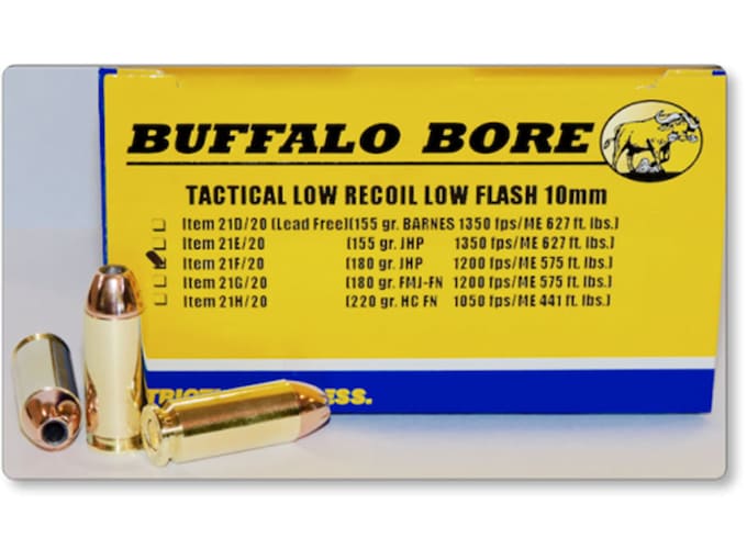 Buffalo Bore loads their ammunition up to maximum SAAMI specifications, which delivers devastating performance on a wide range of game. Please note that this ammunition is not intended for older guns. It is made for modern firearms only, as some of the ammunition could damage older and weaker firearms. This ammunition is new production, non-corrosive, in boxer primed, reloadable brass cases. ?Buffalo Bore full power loads were originally designed for outdoor uses such as hunting deer or stopping aggressive bears and these full power loads are wonderful for these types of applications. However, for general self defense, the excessive recoil and muzzle blast of turbo charged 10MM ammo becomes a disadvantage for fast follow-up shots needed for multiple assailants or armed human targets in general. Too much power/over-kill is not a bad thing, until you have to deal with the unnecessary recoil and muzzle blast/flash, which can put you at a tactical disadvantage. Buffalo Bore designed these new?Tactical 10MM?loads specifically to give every advantage to the user in the event that your 10MM pistol is needed in protecting you or loved ones against human threat. If your main purpose for carrying a 10MM pistol is outdoor usage, we suggest you stick with the full power 10MM (items 21A, 21B and 21C) loads. However, those of you who choose to carry a 10MM pistol for social purposes, would be best advised to carry these Tactical loads which are more than powerful enough to quell any human threat, but will offer you more control and faster, more accurate follow-up shots. Buffalo Bore Tactical loads utilize low-flash powders. This is an advantage should you be required to drop the hammer in low light, which is when most human predators are out and about.WARNING: This product can expose you to Lead, which is known to the State of California to cause cancer and birth defects or other reproductive harm. For more information go to – www.P65Warnings.ca.gov.