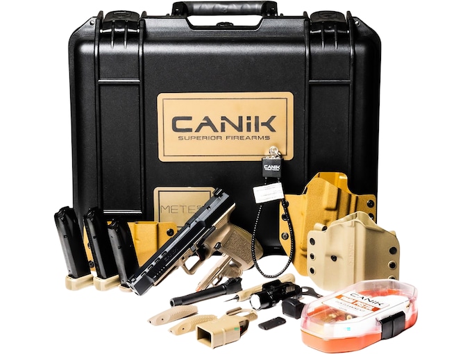 First time buying a gun online?Learn everything you need to make an informed purchase in our Definitive Guide for Buying Guns Online.Read MoreThe Canik METE series incorporates changes designed to take a great product and elevate it to the next level of semi-automatic sporting pistols. The external changes are subtle but are instantly recognizable when handling the firearm. An integrally flared mag-well allows for fluid reloads and extra support for the grip, aggressive texturing to include the front of the grip allows for increased stability, the double undercut trigger guard secures the support hand on the firearm, the low profile slide stop lever and angled rear sight edge increase functionality in a multitude of situations, a co-witnessing optics ready slide cut now accepting everything from a Trijicon RMRcc all the way to a micro optic allows for a constant and reliable sight picture, an ergonomically redesigned beavertail for comfortability, and a holster fit-and-lock (HFL) system for retention in the holster. The internal changes begin with easy in / easy out push pins that can be removed using slight pressure and the Canik punch. From there the entire platforms internals are modular in a sense that it can be completely disassembled and then reassembled with ease using only the aforementioned Canik punch.?FeaturesShort reset Single-Action trigger design with nickel-coated action components3-Dot white sightsAggressive front and rear slide serrations for positive-traction handling1913 Picatinny under-barrel railSide reversible magazine catchAlternate backstraps for a custom fitIncludes two 20 round and two 18 round magazinesErgonomically redesigned beavertailIncludes flared mag-wellIncludes OLIGHTIncludes Holster, Holster for OLIGHT, and Holster for 2 magsIncludes MeCanik OpticWARNING: Cancer and Reproductive Harm – www.P65Warnings.ca.gov.