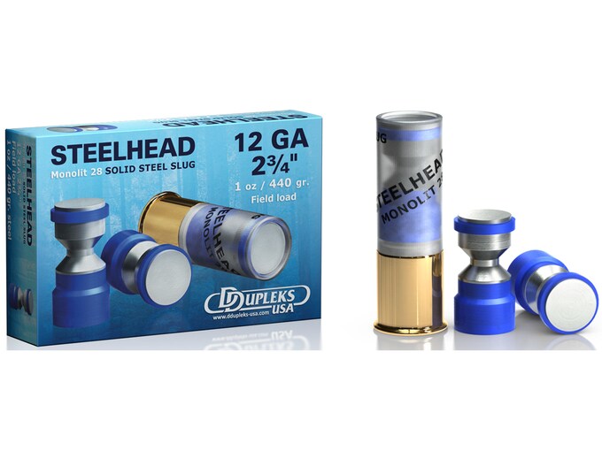 The DDupleks solid slug design provides excellent penetration capabilities suitable for big game hunting. The Steelhead slug is designed for hunting in overgrown areas where increased stability and resistance against obstacles is necessary. FeaturesNon-toxic steel and polyethylene constructionSolid steel construction for deep penetration to reach vital organsFlat ogive for maximum energy transferWaisted slug body provides aerodynamic self-stabilizationPolyethylene bearing surfaces reduce bore frictionSuitable for both smoothbore and rifled barrelsSafe for all chokesExcellent penetration in heavy brushReduced possibility of ricochetsNo lead or plastic foulingWARNING: This product can expose you to Lead, which is known to the State of California to cause cancer and birth defects or other reproductive harm. For more information go to – www.P65Warnings.ca.gov.