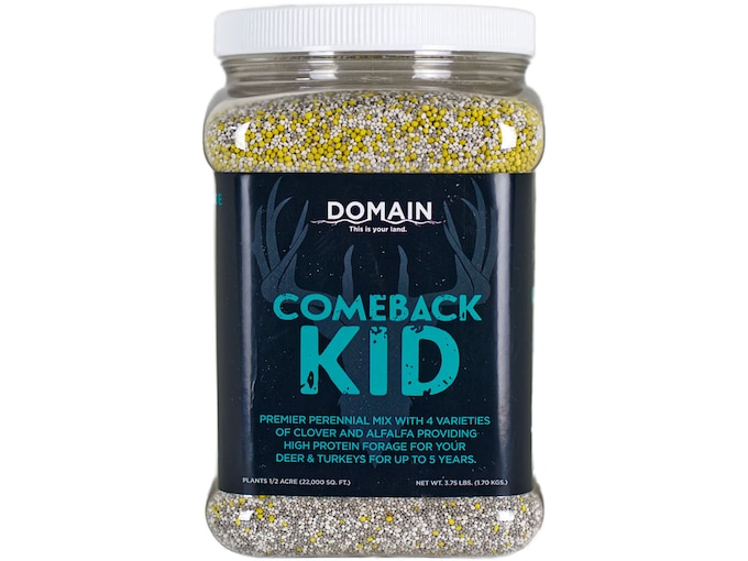 Domain Outdoor Comback Kid Food Plot Seed will give you up to 5 years of growth with 1 planting, shade tolerant and easy to maintain!Loaded with a mixture of cold season perennials and annuals, this protein-rich, tonnage producing clover mix is designed for year-round food production and attraction for deer and turkey. By combining special varieties of clover and alfalfa we have created a perennial mix that will establish quickly and last up to 5 years. Comeback kid contains 4 special varieties of clover and 1 variety of alfalfa to create an absolute deer magnet providing forages with protein levels above 30%. When your clover plants begin to flower it signals their maturity, making it a great time to mow the plot down to 6-8?. Periodic mowing helps eliminate unwanted weeds and generates re-growth of the clover and alfalfa, keeping them strong and healthy. It?s during this growth stage that your comeback kid food plot will provide the highest level of nutrition and deer activity. Comeback kid is designed to be the foundation of your food plot program, as it provides the backbone of deer nutrition with it?s high protein forages, will be the first to germinate in the spring and is extremely cold tolerant into the dead of a northern winter?comeback kid can play an integral role in the health of your herd and the success of your food plot program.Comeback kid is our favorite perennial mix for winter/spring frost seeding as well – which can be a very effective way to “naturally” plant perennials.Comeback kid has also become one of our most popular mixes for shady backwoods areas and logging roads – since it offers great shade tolerance, longevity and is easy to maintain.? For areas with high shade, we recommend planting in the early spring to allow plants to establish strong roots and stems before the leaf canopy develops.Planting GuidePlanting DatesNorth: March-June/August-SeptemberCentral: March-May/August-SeptemberSouth: February-April/September-OctoberSeed Depth: 1/4″ Or LessSeed Rate: 7.5lbs/AcreFull or Partial Sun LocationMinimal Tilling RequiredDark/Rich, Loam, Sand, Moist SoilpH Range: 6 – 7? Made In United States of America