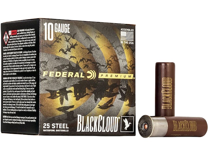 ? Sealed crimp defeats moisture in extreme conditionsFederal Black Cloud ammunition takes non-toxic steel loads to the next level of performance. Equipped with the FLITECONTROL FLEX wad, Black Cloud delivers improved pattern density and consistency through both ported and standard waterfowl chokes. The wad?s redesigned rear-deploying petals and side-mounted vents stimulate the payload for separation from the wad at the ideal moment for dense, deadly patterns. Plus, the efficient Catalyst lead-free primer and clean-burning, temperature-stable propellant significantly decrease residue in the barrel.? Made In United States of AmericaWARNING: This product can expose you to Lead, which is known to the State of California to cause cancer and birth defects or other reproductive harm. For more information go to – www.P65Warnings.ca.gov.