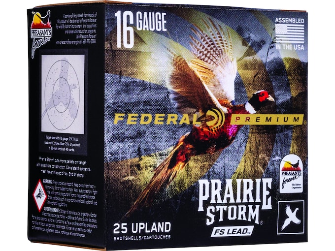Federal Premium Prairie Storm FS Lead loads use the updated FLITECONTROL FLEX wad and a mixed payload of standard pellets and FLITESTOPPER lead to produce full, consistent patterns from these smaller payloads. The improved wad design can be used through both ported and standard upland chokes for even better patterning and versatility. Don?t settle for sub-par performance from your sub-gauge shotgun.?FeaturesFLITECONTROL FLEX wad can be used through all upland chokesPayload mix of 70 percent standard copper-plated lead and 30 percent FLITESTOPPER lead produces even edge-to-edge patternsFLITESTOPPER pellets create bigger wound channels? Made In United States of AmericaWARNING: This product can expose you to Lead, which is known to the State of California to cause cancer and birth defects or other reproductive harm. For more information go to – www.P65Warnings.ca.gov.