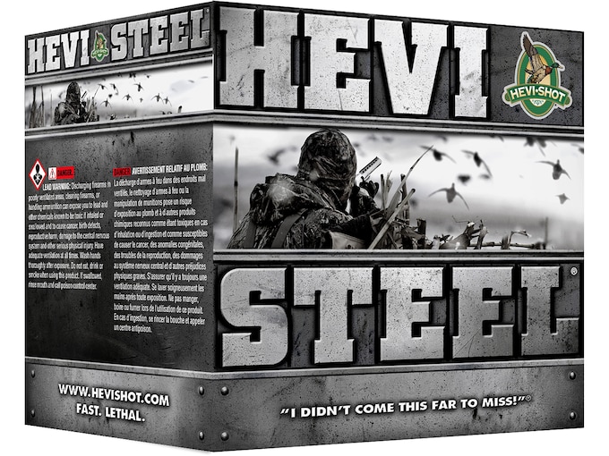 Sometimes speed is everything. The first all-steel shotshell from HEVI-Shot, HEVI-Steel is pushed at higher velocities than competing loads. That speed boost delivers more energy downrange and makes it easier to connect on ducks and geese. Combined with a best-inclass wad, HEVI-Steel provides more knockdown power. Features8 g/cc precision steel pelletsHigh velocity provides more downrange energyClean-burning propellantBest-in-class wadDependable ignition Made In United States of AmericaWARNING: This product can expose you to Lead, which is known to the State of California to cause cancer and birth defects or other reproductive harm. For more information go to – www.P65Warnings.ca.gov.