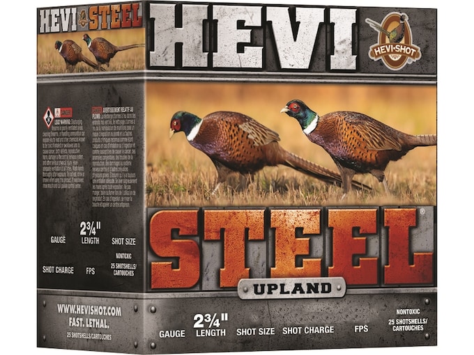 When a dove races across a field or a covey of quail erupts at your feet, speed matters. That’s why HEVI-Steel Upland is faster than competing steel loads. The velocity boost makes it easier to connect on hard-flying birds and delivers more energy on impact. Aided by the best-in-class wad and precision manufacturing techniques, HEVI-Steel Upland hits hard every time Features7.8 g/cc precision steel pelletsUnique HEVI-Shot wad produces exceptionally tight patternsHigh velocity provides more downrange energyDependable ignition Made In United States of AmericaWARNING: This product can expose you to Lead, which is known to the State of California to cause cancer and birth defects or other reproductive harm. For more information go to – www.P65Warnings.ca.gov.