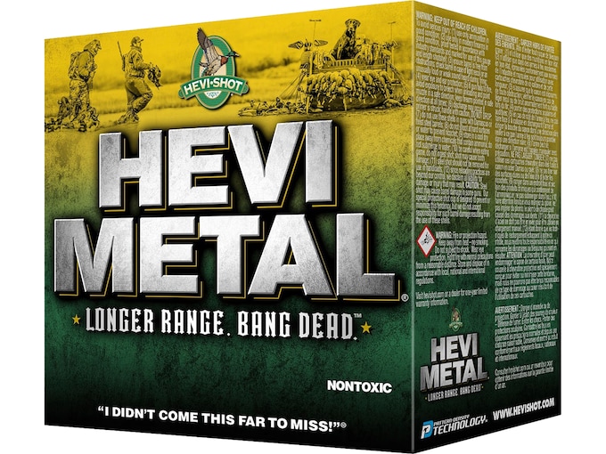 Push duck and goose hunts farther. HEVI-Metal Longer Range increases downrange power 16 percent, thanks to high-density HEVI-Bismuth alloy pellets layered over corrosion-resistant steel shot. Using Pattern Density Technology, 30 percent of the payload is HEVI-Bismuth, while 70 percent is steel. It all comes together for tighter patterns, longer range and cleaner kills. FeaturesLethal at longer rangesPattern Density Technology Leading 30 percent of the payload is made up of 9.6 g/cc HEVI-Bismuth pelletsRemaining 70 percent is corrosion-resistant steelImproved cold-weather performanceCycles more reliably in all shotguns Made In United States of AmericaWARNING: This product can expose you to Lead, which is known to the State of California to cause cancer and birth defects or other reproductive harm. For more information go to – www.P65Warnings.ca.gov.