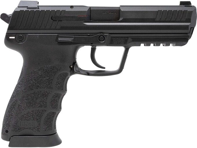 First time buying a gun online?Learn everything you need to make an informed purchase in our Definitive Guide for Buying Guns Online.Read MoreThe HK45 was developed as a product improvement of the highly regarded USP45, first released in the 1995. The Caliber .45 ACP HK45 includes several user-inspired enhancements including changeable grip panels (backstraps), a Picatinny MIL-STD-1913 accessory rail, better ergonomics, and more ambidextrous controls.Along with the HK45 Compact, the HK45 was developed as a possible candidate for the Joint Combat Pistol (JCP) and Combat Pistol (CP) programs administered by the U.S. military in their search for a new service handgun to replace the 9-millimeter M9. These programs were suspended before completion and no pistols were selected.The HK45 uses an HK proprietary O-ring barrel for precise barrel-to-slide lockup and optimal accuracy. HK45 barrels are made using the famous HK cold-hammer forging process for superior performance.Using HK’ s unique internal mechanical recoil reduction system reduces the recoil forces imparted to the weapon and shooter by as much as 30%, improving shooter control during rapid firing and increasing component service life. Capable of firing standard .45 ACP ball through +P ammunition, the HK45 combines the accuracy, modularity, reliability and minimum 20,000 round service life of the famed USP45 series with the improved ergonomics of the P2000 series pistols. HK45 models can be also be fitted with threaded barrels for use with muzzle mounted sound suppressors.Each HK45 comes standard with an extra backstrap; medium and small interchangeable backstraps ensure an optimal fit for most shooter’ s hands and complement the ergonomic profile grip.An improved USP-style control lever, a combination safety and decocking lever, is frame mounted on the HK45 and is quickly accessible. The HK45 control lever has a positive stop and returns to the ” fire” position after decocking.By using the modular approach to the internal components first pioneered by HK on the USP, the control lever function of the HK45 can be switched from the left to the right side of the pistol to accommodate left-handed shooters (additional parts required). Left and right mounted control levers provide safety and/or decocking functions as required and can be fitted to the pistol simply by changing parts. For true ambidextrous use, a control lever can also be mounted on both sides of the pistol if required.Well-suited for personal defense use, the HK45 is available in, or can be converted to, a wide variety of variants that use different trigger firing modes, including double action/single action (DA/SA) and DAO (double action only). The DAO mode uses the unique Heckler & Koch LEM (Law Enforcement Modification) firing system for improved double action trigger pull. FeaturesDouble Action, or Single ActionAmbidextrous ControlsHammer Decocking LeverWARNING: Cancer and Reproductive Harm – www.P65Warnings.ca.gov.