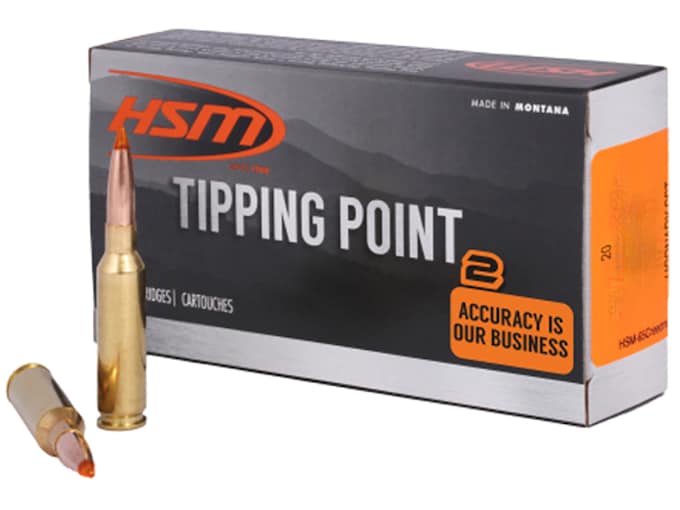 With HSM Ammo?s Tipping Point2, hunters get less drag, greater stability, and superior accuracy. Tipping Point 2 ammunition is deadly accurate and capable of creating a substantial wound channel. Add that to the promised accuracy of this ammo and you have the perfect recipe for a fantastic hunt. This ammunition is made from quality materials with strict attention to detail and high expectations for consistent, superior overall performance. Match grade accuracy combined with a payoff of extreme terminal results. The very best cases, primers, and powder, topped off with the Hornady SST bullets. An extraordinary cartridge providing an ultimate advantage. This ammunition is new production, non-corrosive, in boxer-primed, reloadable brass cases.?Super Shock Tip Bullets combine proven Hornady performance with a higher ballistic coefficient than available with most hunting bullets. The sharp, pointed polymer tip creates a faster, flatter shooting bullet. With its one-piece core and jacket strengthened in critical areas, the SST delivers much more controlled expansion and superior weight retention than other tipped bullets. Featuring Hornady’s trade mark Interlock ring system, this bullet’s core and jacket remain locked solid during expansion, creating massive wound channels.?FeaturesOrange polymer tip, which is the classic HSM color. It also means that on impact, the hard tip drives itself back into the lead core of the bullet for fast, reliable expansion.Secant ogive, boattail profile. This design increases the bullet?s bearing surface and creates a more aerodynamic profile. These key features create a more stable, flatter-shooting bullet.A mid-body cannelure is used to keep the core and jacket together for superior performance while also providing a secure crimp during the loading process.InterLock Ring. This detail mechanically locks the core and jacket together which serves to maintain bullet integrity during expansion which is a must for good weight retention and consistent performance? Made In United States of AmericaWARNING: This product can expose you to Lead, which is known to the State of California to cause cancer and birth defects or other reproductive harm. For more information go to – www.P65Warnings.ca.gov.