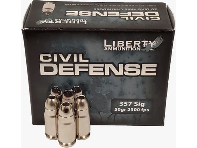Liberty Civil Defense ammunition is a high velocity, extremely accurate load designed for self-defense. The 50 Grain Lead-Free Fragmenting Hollow Point bullet travels at 2300 feet per second, resulting in 12 inches of ballistic gel penetration and a permanent wound cavity greater than 3.5 inches in diameter. Compared to other 357 Sig self-defense rounds, this light bullet, high velocity round yields 43%-46% less felt recoil, 64%-87% more velocity and 16%-46% more kinetic energy with an effective range of 25 meters. This ammunition is new production, non-corrosive, and requires no weapons modifications.? Made In United States of AmericaWARNING: This product can expose you to Lead, which is known to the State of California to cause cancer and birth defects or other reproductive harm. For more information go to – www.P65Warnings.ca.gov.