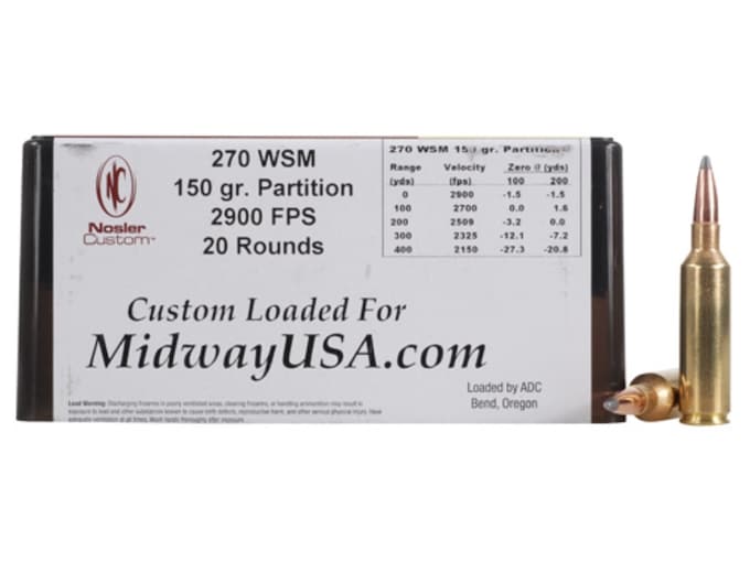 You're viewing: Nosler Custom 270 Winchester Short Magnum (WSM) Ammo 150 Grain Nosler Partition Jacketed Soft Point Box of 20 $97.99 $78.39
