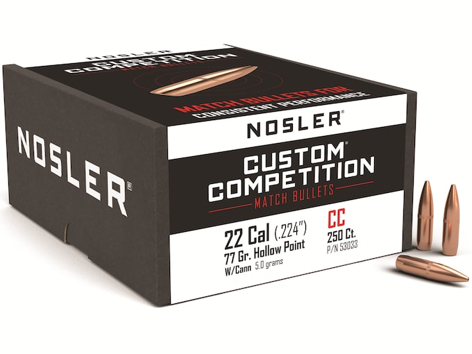 Nosler Custom Competition bullets blend match winning accuracy and consistency with maximum value for performance-minded shooters. Highly concentric jackets, ultra precise lead alloy cores and hand inspected quality offer competitive shooters more, for less. The small meplat, provided by the hollow point, results in reduced drag and increased aerodynamic efficiency. This 77 Grain Match bullet features a cannelure. This is not loaded ammunition.