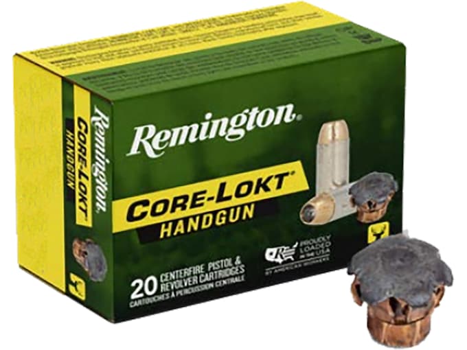 Remington Core-Lokt Handgun lets every pistol and revolver hunter shoot the same ammo that has dropped more deer than any other since 1949. True Deadly Mushroom hollow point projectiles are optimized for ultimate handgun hunting on game. Nickel-plated rounds loaded with heavy-for-caliber bullets provide powerful shots and smooth, reliable cycling. Trusted Core-Lokt bullets provide superior expansion and weight retention with accurate, terminal results. Engineered for optimal penetration and fine-tuned for pistol-length barrels, Core-Lokt Handgun is ready for your next whitetail, hog, or black bear hunt. This ammunition is new production, non-corrosive, in boxer primed, reloadable nickel-plated brass cases.FeaturesCLASSIC CORE-LOKT PROJECTILES: Superior expansion, high weight retention and deep penetration with a unique hollow point designPREMIER NICKEL-PLATED CASES: Smooth, reliable, flawless function in any type of handgun or revolverHANDGUN HUNTING APPROVED: Potent and powerful, heavy weighted caliber bullets? Made In United States of AmericaWARNING: This product can expose you to Lead, which is known to the State of California to cause cancer and birth defects or other reproductive harm. For more information go to – www.P65Warnings.ca.gov.