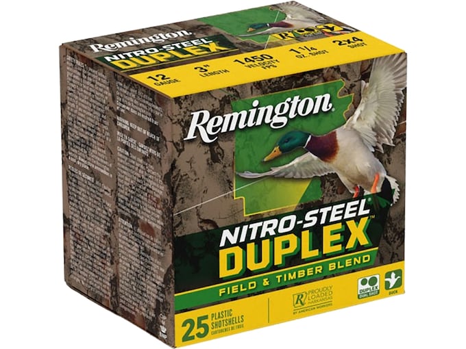 Remington Nitro Steel Duplex shells are ready and deadly duck loads for southern fields, marshes and woods. From close shots in thick cover to a long approach over flooded cropland, dual-shot technology gives ultimate performance on all types of waterfowl across any hunting range. High velocity steel payloads give dense patterns close with the smaller shot size, while the larger shot maintains energy farther out.?FeaturesTwo shot sizes for deadly patterns at all rangesTough, versatile wad cushions shot and performs across wide range of choke tubesMaximum velocity for true magnum-blended steel payloadsHigh base, quality head and drab hull for less reflection Made In United States of AmericaWARNING: This product can expose you to Lead, which is known to the State of California to cause cancer and birth defects or other reproductive harm. For more information go to – www.P65Warnings.ca.gov.
