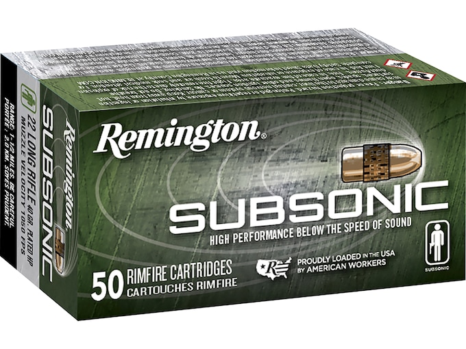 Remington Subsonic Ammunition delivers superior stealth and consistency below the sound barrier. Its tack-driving rimfire performance was developed through a joint effort of Remington and AAC team experts, manufactured with tight velocity control to eliminate supersonic cracks. Driving a copper-plated, hollow- point bullet optimized for reduced lead buildup in silencer ports and maximum effectiveness at lower velocity. Made In United States of AmericaWARNING: This product can expose you to Lead, which is known to the State of California to cause cancer and birth defects or other reproductive harm. For more information go to – www.P65Warnings.ca.gov.