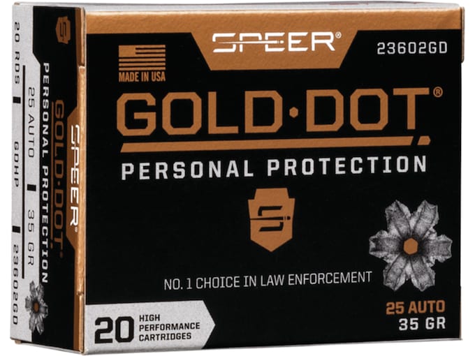 Speer Gold Dot Ammunition is loaded with bonded core bullets and designed for home defense and personal protection. All Gold Dot bullets are built using Speer?s exclusive Uni-Cor method. The jacket is bonded to the core one molecule at a time, virtually eliminating core-jacket separation and creating a precision hollow point that is accurate, tough and unbelievably consistent through all common barriers. Gold Dot has earned the respect of police officers world-wide. No other ammunition combines such a consistent level of high performance. These loads deliver in all situations, which is why you can trust them for home and personal defense. Gold Dot hollow-point bullets are very accurate, tough and unbelievably consistent.This ammunition is new production, non-corrosive, in boxer primed, reloadable, Nickel-Plated brass cases. ?FeaturesConsistent penetration and expansion through common barriersExtremely uniform jacket maximizes accuracyGold Dot technology virtually eliminates core-jacket separationNickel-plated brassReliable, sensitive CCI primer? Made In United States of AmericaWARNING: This product can expose you to Lead, which is known to the State of California to cause cancer and birth defects or other reproductive harm. For more information go to – www.P65Warnings.ca.gov.