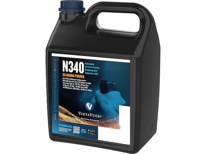 The N300 series powders are single base porous powders for handguns. Formerly known as 3N18, the N340 is a true multipurpose powder, developed originally for 9mm and shotshell loads. This pistol powder is one of the most popular powders in the Vihtavuori N300 series, and it can be used for a wide variety of calibers and bullet weights, making it the perfect partner for all kinds of reloading purposes. The N340 is used especially for medium and large caliber pistols and shotshells with medium and heavy loads. N340 is a tubular powder type with grain dimensions of 1,0mm length and 0,8 mm diameter. Exactly the same grain size as with powder N320, N330 and N350 ? only the porosity of the powder changes. The burning rate of the N340 is at the medium scale of Vihtavuori handgun powders ? and as with powder N320, with N340 extremely clean burning and no residuals is guaranteed.