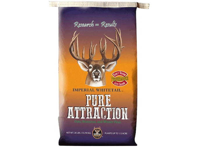 Whitetail Institute Pure Attraction Food Plot Mix is a product that will provide abundant, nutritious forage for fall and winter that grows rapidly and is extremely attractive to deer in both the early and late hunting seasons. Pure Attraction?s early-season attraction and nutrition come from Whitetail Oats. Whitetail Institute forage brassicas provide abundant forage during the coldest months of the winter. You?ll be amazed at how quickly and hard the deer will hit it.FeaturesBlend of Oats, Brassicas, and Winter PeasCold tolerantHigh-sugarEstablishes and grows quicklyExtreme drought and cold tolerantCovers 0.5 Acres Made In United States of AmericaWARNING: Cancer and Reproductive Harm – www.P65Warnings.ca.gov.