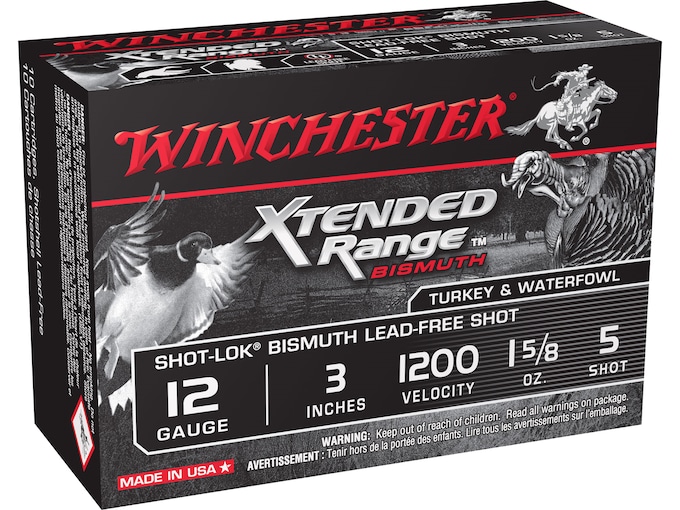 Winchester Xtended RangeTM Bismuth pairs ShotLok Technology with bismuth shot, resulting in optimum performance for turkey, waterfowl and upland hunting in areas that require lead-free shot. With density greater than steel, bismuth shot offers improved penetration that nears that of standard lead loads. ShotLok Technology is used to protect the bismuth shot from fracturing, which improves pattern density and increases downrange energy, when compared to standard lead loads. Xtended Range Bismuth puts twice the number of pellets in a 20-inch circle at 60 yards. Made In United States of AmericaWARNING: This product can expose you to Lead, which is known to the State of California to cause cancer and birth defects or other reproductive harm. For more information go to – www.P65Warnings.ca.gov.